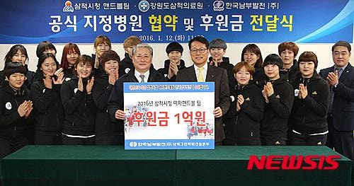 【삼척=뉴시스】홍춘봉 기자 = 김양호 강원 삼척시장은 12일 시청 상황실에서 삼척시청핸드볼선수단 소속 선수들이 참가한 가운데 안관식 한국남부발전(주) 삼척그린파워건설본부장과 후원협약서 및 후원금 전달식을 진행하고 있다. 2016.01.12. (사진=삼척시 제공) photo@newsis.com