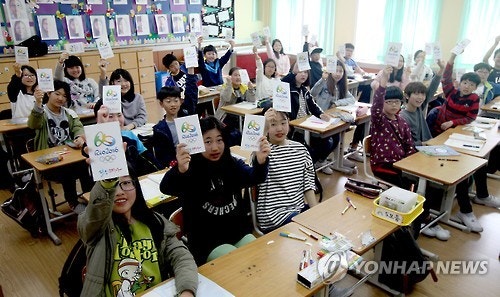 여자핸드볼 국가대표 응원 손편지 (제주=연합뉴스) 전지혜 기자 = 14일 제주시 광양초등학교에서 학생들이 여자 핸드볼 국가대표 선수들을 응원하는 손편지를 써서 흔들어보이고 있다. 2016.4.14 atoz@yna.co.kr