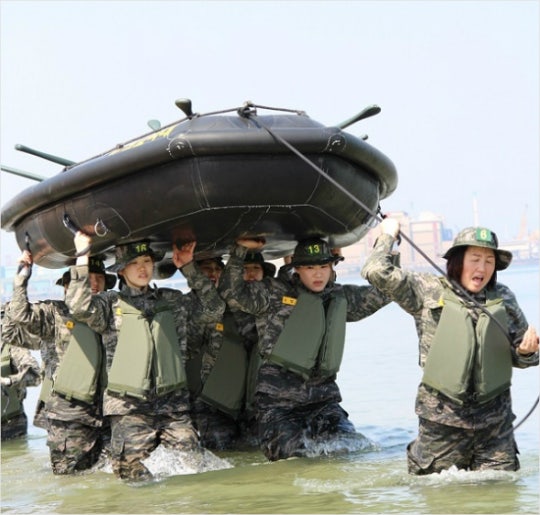 마흔다섯 나이에도 해병대 훈련까지 소화해낸 오영란(오른쪽). (사진=대한핸드볼협회 제공)