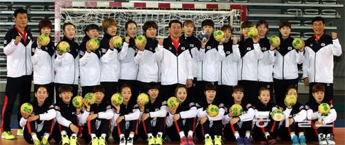“응원해 주세요” 임영철 감독(뒷줄 가운데)이 지휘하는 여자 핸드볼 국가대표팀이 23일 서울 올림픽공원 SK핸드볼경기장에서 가진 미디어데이 행사 때 8월 열리는 리우데자네이루 올림픽에서의 선전을 다짐하고 있다. 김경제 기자 kjk5873@donga.com