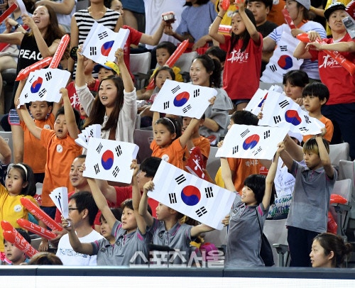 | | 남자 핸드볼대표팀의 선수들이 25일 서울 올림픽공원 SK핸드볼경기장에서 진행된 ‘2016 국가대표 핸드볼 한일 정기전’에서 치열한 승부를 치르는 가운데, 태극기를 든 어린이 팬들이 뜨거운 응원을 펼치고 있다. 2016.06.25. 김도훈기자 dica@sportsseoul.com |