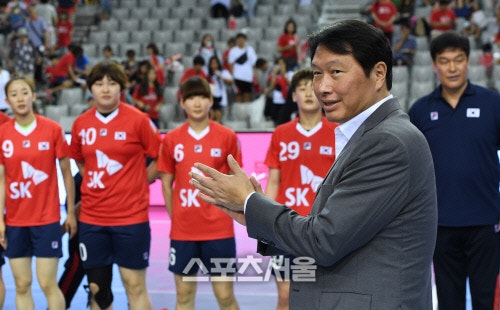 | | 최태원 대한핸드볼협회 회장이 25일 서울 올림픽공원 SK핸드볼경기장에서 진행된 ‘2016 국가대표 핸드볼 한일 정기전’에서 여자부 경기를 마친 뒤 선수들을 박수로 격려하고 있다. 2016.06.25. 김도훈기자 dica@sportsseoul.com |