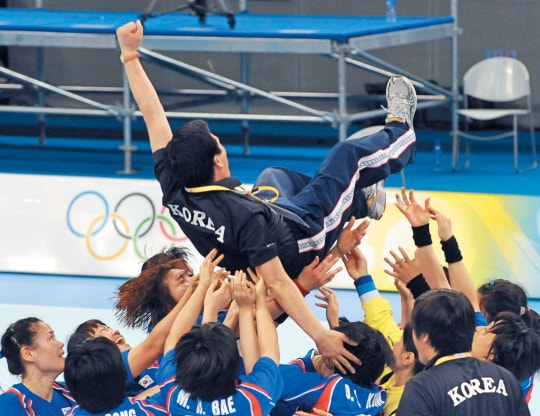 한국 여자 핸드볼 대표팀 선수들이 2008년 8월 23일 베이징올림픽체육관에서 열린 3·4위전에서 헝가리 팀을 꺾은 뒤 임영철 감독을 헹가래치고 있다. 임 감독은 이날 경기에서 종료 1분을 남겨 놓고 은퇴를 앞둔 선수들을 뛰게 했다. 임 감독은 “선수들의 가족이 ‘우리 딸 핸드볼 시키길 잘했다’고 뿌듯해하길 바랐다”고 했다. / 조선일보 DB