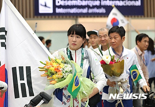 【리우데자네이루=뉴시스】 장세영 기자 = 기수 핸드볼 오영란이 2016브라질 리우하계올림픽 개막을 8일 앞둔 28일(한국시간) 브라질 리우데자네이루 국제공항을 통해 입국하고 있다. 정몽규 선수단장이 이끄는 국가대표 선수단 본진은 금메달 10개 이상을 획득해 세계 종합 10위 안에 들겠다는 목표로 리우로 향했다. 2016.07.27. photothink@newsis.com