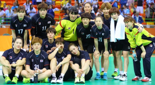 울컥 - 올림픽 사상 첫 조별예선 탈락의 아픔을 맛본 여자핸드볼 대표팀이 14일(현지시간) 브라질 리우데자네이루의 푸투루 경기장에서 열린 아르헨티나와의 조별리그 마지막 경기에서 승리하고도 활짝 웃지 못한 채 기념사진을 찍고 있다. 대표팀의 맏언니이자 ‘우생순’(우리 생애 최고의 순간) 신화의 주인공인 오영란(뒷줄 왼쪽 세 번째)도 눈물을 글썽이고 있다.리우데자네이루 연합뉴스