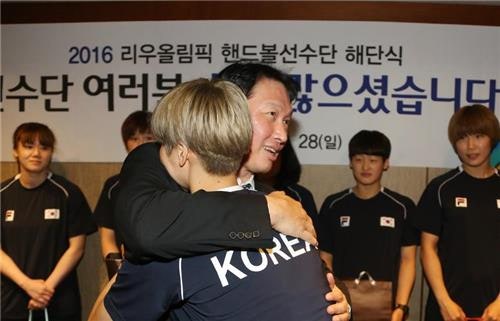 최태원 회장이 28일 저녁 리우올림픽 핸드볼 선수단 해단식에서 권한나 선수를 격려하고 있다 [SK 제공= 연합뉴스]