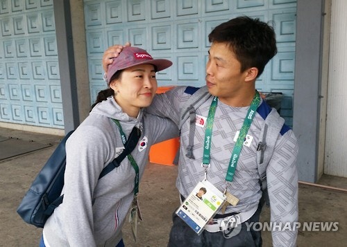 <올림픽>격려하는 부부 역사 (리우데자네이루=연합뉴스) 하남직 기자 = ''부부 역사'' 윤진희(왼쪽)와 원정식 부부가 9일(한국시간) 열린 남자 62kg급 경기가 끝난 뒤 만나 서로 격려하고 있다. 2016.8.10 jiks79@yna.co.kr