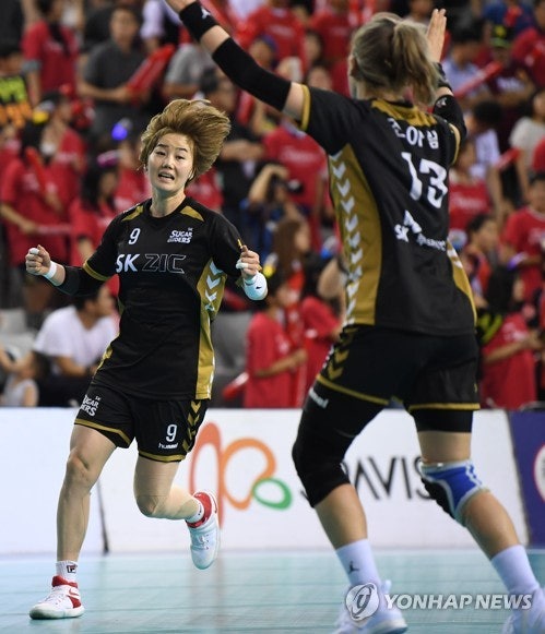 우승예감 김온아(서울=연합뉴스) 황광모 기자 = 12일 오후 서울 올림픽공원 내 SK핸드볼경기장에서 열린 2017 SK핸드볼코리아리그 여자부 챔피언결정전 SK슈가글라이더즈와 서울시청의 경기에서 SK의 김온아가 결승 페널티 슛을 성공한 뒤 환호하고 있다. 2017.7.12