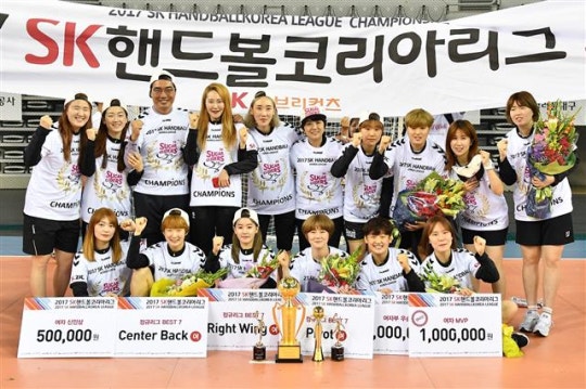 지난 12일 서울 송파구 올림픽공원 핸드볼경기장에서 열린 2017 코리아리그 여자부 챔피언 결정 3차전에서 서울시청을 31-30으로 누른 SK슈가글라이더즈 선수들이 주먹을 쥐며 기뻐하고 있다.연합뉴스