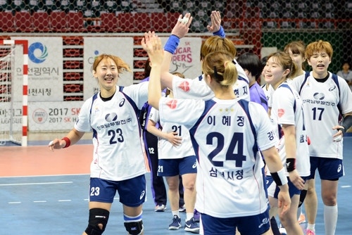 핸드볼리그 준PO에서 승리한 삼척시청 선수들. [대한핸드볼협회 제공=연합뉴스]