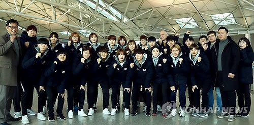 ''명예회복'' 노리는 여자핸드볼 대표팀, 12월 세계선수권 출격(서울=연합뉴스) 독일에서 개막하는 제23회 세계선수권대회 출전하는 여자핸드볼 국가대표팀이 21일 오후 인천공항에서 출국하며 파이팅하고 있다. 2017.11.21 [대한핸드볼협회 제공=연합뉴스]