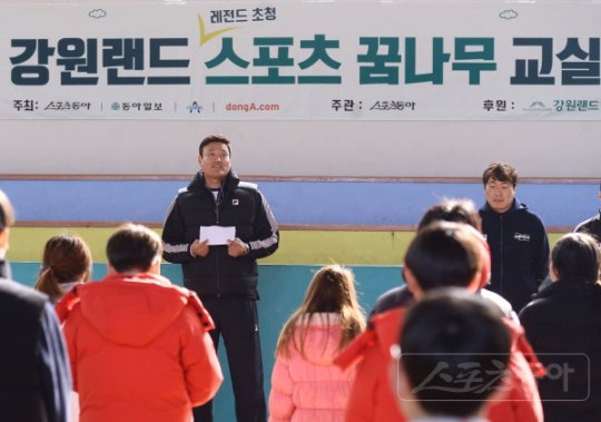 한국 핸드볼의 살아있는 전설 윤경신 두산 핸드볼팀 감독이 7일 강원도 태백시 장성초등학교에서 열린 ‘강원랜드 레전드 초청 스포츠 꿈나무 교실’ 행사에서 유소년 선수들과 즐거운 시간을 보냈다. 노하우를 전하는 윤 감독이나, 가르침을 받는 학생들이나 모두 환한 미소를 짓는 뜻 깊은 시간이었다. 태백 | 김진환 기자 kwangshin00@donga.com