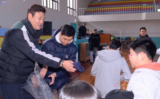 다행히 눈은 그쳤고 큰 길은 운전하기 수월했다. 윤 감독은 출발을 서둘렀고 약속 시간보다 30분 일찍 태백 장성초등학교에 도착했다. 체육관 문을 연 순간, 아이들은 동시에 멈춰 섰고 잠시 아무 소리도 하지 못했다. “진짜 크다”, “진짜 왔다”라는 수군거림이 좀 더 이어진 후에야 아이들은 수줍게 인사했다. 윤 감독은 활짝 웃었고 직접 아이들에게 선물하기 위해 챙긴 사인볼과 자신의 현역 시절 유니폼, 두산 로고가 새겨진 털모자를 꺼냈다.