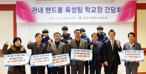 광주시체육회는 19일 광주 남구 프라도호텔에서 광주지역 핸드볼 육성학교장들을 초청해 간담회를 열고 조선대부속고등학교 등 6개 초·중·고등학교 선수단에 훈련지원금과 동계 피복을 전달했다.