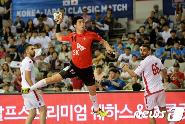 윤시열이 16일 SK핸드볼경기장에서 열린 ''핸드볼 프리미어 6'' 바레인과의 1차전에서 슛을 시도하고 있다.(대한핸드볼협회 제공) © News1