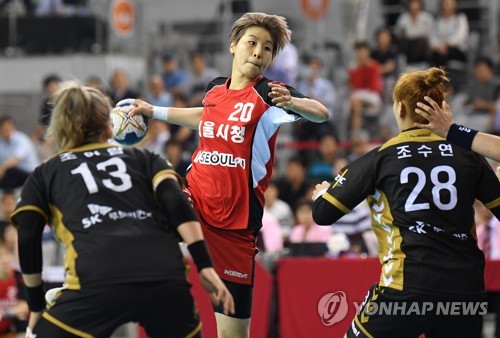 슛 하는 권한나(서울=연합뉴스) 황광모 기자 = 12일 오후 서울 올림픽공원 내 SK핸드볼경기장에서 열린 2017 SK핸드볼코리아리그 여자부 챔피언결정전 SK슈가글라이더즈와 서울시청의 경기에서 서울시청의 권한나가 점프슛을 하고 있다. 2017.7.12