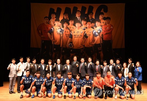 하남시청 핸드볼팀 창단(서울=연합뉴스) 하남시청 핸드볼팀이 30일 경기도 하남문화예술회관에서 창단식을 하고 국내 남자 실업 6번째 구단으로 탄생했다. 지난해부터 창단을 준비해온 하남시청은 기존 두산, SK, 충남체육회, 인천도시공사, 상무에 이어 6번째 남자 실업팀으로 11월 개막하는 SK코리아리그에 첫선을 보일 예정이다.