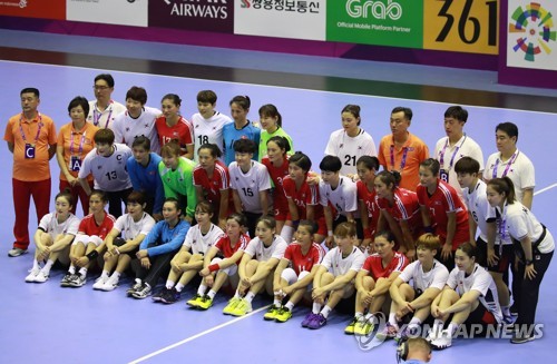 남북, 맞대결에 앞서 하나가 되다(자카르타=연합뉴스) 홍해인 기자 = 14일 오후 인도네시아 자카르타 포키 찌부부르 스타디움에서 열린 2018 자카르타-팔렘방 아시안게임 여자 핸드볼 예선 한국과 북한의 경기에 앞서 남북 선수단이 함께 기념촬영을 하고 있다. 2018.8.14 hihong@yna.co.kr(끝)