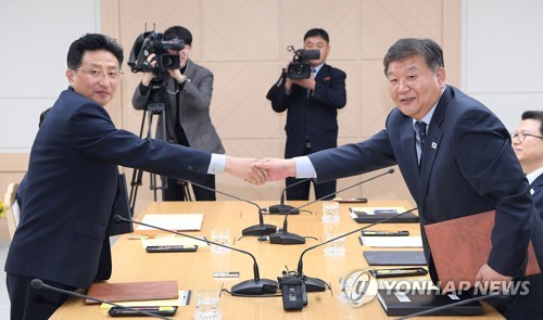 남북체육회담 합의(개성=연합뉴스) 노태강 문화체육관광부 제2차관(오른쪽)이 2일 북측 개성 남북공동연락사무소에서 열린 남북체육분과회담에서 합의문을 교환한 뒤 원길우 북한 체육성 부상과 악수하고 있다.