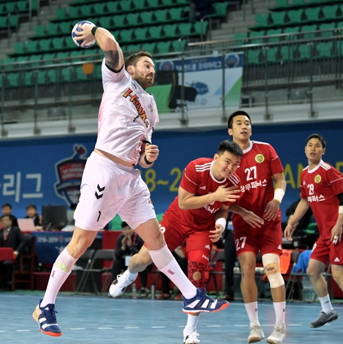 상무를 상대로 슛을 던지는 라조비치.[대한핸드볼협회 제공]
