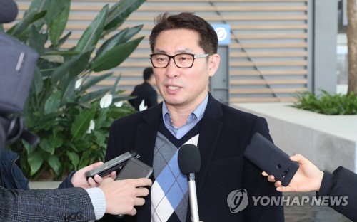 남자핸드볼 남북단일팀 조영신 감독(영종도=연합뉴스) 한상균 기자 = 세계남자핸드볼 선수권대회 남북단일팀 조영신 감독이 21일 인천공항에서 출국 전 기자회견을 하고 있다.