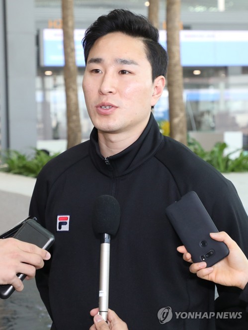 남자핸드볼, 지금 만나러 갑니다(영종도=연합뉴스) 한상균 기자 = 세계남자핸드볼 선수권대회 남북단일팀 정수영 선수가 21일 인천공항에서 출국 전 기자회견을 하고 있다.