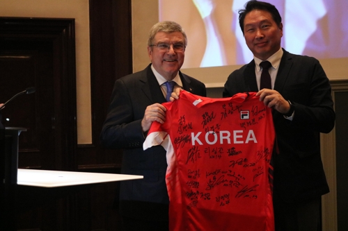 (서울=연합뉴스) 김동찬 기자 = 최태원 대한핸드볼협회장이 토마스 바흐(독일) 국제올림픽위원회(IOC) 위원장을 만나 남북단일팀 선수단 전원이 사인한 대회 유니폼 등을 선물했다.