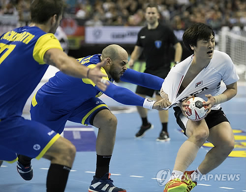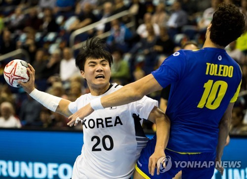 ''이 손 놔''…핸드볼 남북단일팀, 브라질에 패배(베를린 AP=연합뉴스) 17일(현지시간) 독일 베를린의 제26회 세계남자핸드볼선수권대회 조별리그 A조 브라질과의 5차전에서, 공을 가진 남북단일팀의 강정구의 상의를 상대팀 호드리게스가 잡아 당기고 있다. 단일팀은 브라질에 26-35로 패배했으며 일본과 세계선수권 순위 전에서 맞대결을 벌인다. bulls@yna.co.kr