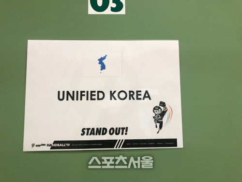남자 핸드볼 코리아 단일팀이 11일 훈련한 독일 베를린 그로세 스포르트할레에 한반도기와 ‘코리아 단일팀’이 새겨진 문패가 걸려 있다. 베를린 | 정재은통신원