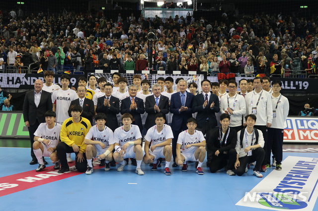 【서울=뉴시스】조영신 감독이 이끄는 남자 핸드볼 남북단일팀이 11일(한국시간) 독일 베를린의 메르세데스 벤츠 아레나에서 열린 제26회 국제핸드볼연맹(IHF) 독일-덴마크 세계선수권대회 개막전에서 독일에 19-30으로 졌다. 핸드볼 단일팀의 첫 국제대회 출전이다. 단체사진이다. (사진 = 대한핸드볼협회 제공)