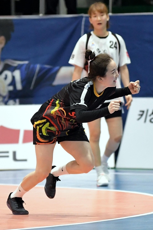 결승골을 넣고 기뻐하는 김선화[대한핸드볼협회 제공]