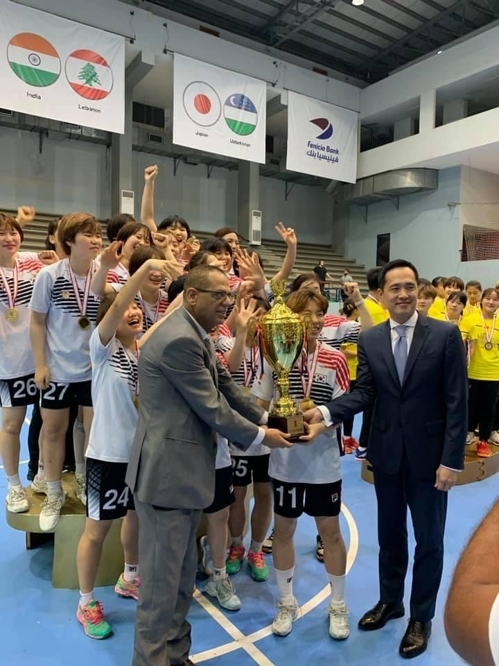 한국 여자 주니어 대표팀이 29일(현지시각) 레바논 베이루트에서 열린 제15회 아시아 여자 주니어 선수권대회 결승에서 일본을 물리치고 우승한 뒤 시상식에서 우승컵을 들고 환호하고 있다. 아시아 핸드볼연맹 SNS 사진 갈무리.