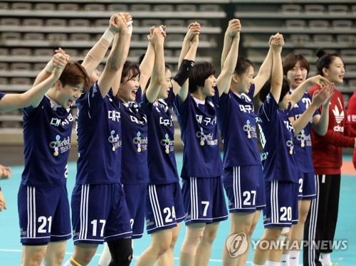 전국체전 여자일반부 컬러풀대구 우승(서울=연합뉴스) 최재구 기자 = 2일 서울 송파구 올림픽공원 핸드볼경기장에서 열린 2019전국체전 핸드볼 여자일반부 결승전에서 인천시청에 승리해 우승을 차지한 컬러풀대구 선수들이 경기 후 환호하고 있다. 2019.9.2 jjaeck9@yna.co.kr