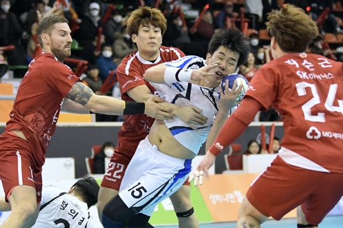 두산과 SK 경기 모습. 가운데 흰색 유니폼은 두산 김동명. [대한핸드볼협회 제공]