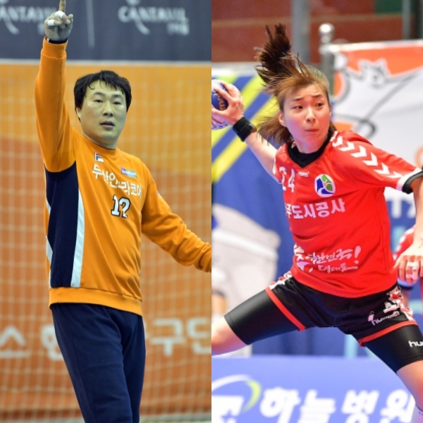 박찬영(좌측)과 강경민(우측)[STN스포츠=이형주 기자]대한핸드볼협회를 빛낸 별들이 수상의 영예를 안았다.협회는 코로나19 여파로 지난 2월 22일 조기 종료된 SK핸드볼코리아리그의 2019-2020 시즌 수상자들을 13일 발표했다.먼저 남녀부 정규리그 MVP의 영광은 각각 박찬영(두산)과 강경민(광주도시공사)에게 돌아갔다. 박찬영은 올 시즌 135세이브, 방어율 43.13%의 놀라운 선방쇼로 두산을 리그 5연패로 이끌었고, 세이브 2위와 함께 방어율 부문 1위를 차지하며 2시즌 연속 GK 방어상도 함께 수상했다. 강경민은 올 시즌 경기 당 평균 8.8득점을 기록하며 득점 부문 1위(123득점)에 오르는 등 광주도시공사를 하위권에서 탈출시키는 일등 공신 역할을 했다. 통상적으로 정규리그 MVP 타이틀은 정규리그 1위팀 선수에게 주어졌지만 올 시즌 여자부는 그 어느때보다 치열했던 만큼 6위 광주도시공사에서 MVP 선수가 배출됐다.남자부 득점상은 정수영과 박광순(이상 하남시청)이 나란히 69득점으로 1위를 차지하며 공동 수상을 하게 됐고, 특히, 박광순은 리그 데뷔 2시즌 연속 득점상을 차지하는 기염을 토했다. 정수영은 어시스트 부문도 1위(50어시스트)를 차지하며 남자부 공격포인트 1위도 함께 기록했다. 여자부 어시스트상은 컬러풀대구에서 묵묵히 팀을 이끈 김아영이 68개로 1위를 차지했고, 삼척시청 박미라가 38.56%의 방어율을 달성하며 GK방어상을 수상, 8시즌 연속 방어상 부문 수상이라는 전무후무한 대기록을 세웠다.올 시즌 신인왕 남자부는 짧지만 강한 인상을 남긴 하남시청 박재용(54세이브, 방어율 38.57%)이 선정되었으며 여자부는 드래프트 전체 1순위로 서울시청 유니폼을 입은 우빛나가 47득점(공동 21위), 14어시스트(공동 34위)로 데뷔 시즌 맹활약을 펼치며 선정됐다.이 밖에 올시즌 내내 최고 활약을 펼친 각 포지션별 1명씩 주어지는 올스타팀도 선정됐다. 남자부는 센터백 정의경(두산), 레프트백 박광순, 라이트백 정수영(이상 하남시청), 레프트윙 최범문(충남도청), 라이트윙 황도엽(두산), 피봇 김동명(두산), 골키퍼 박찬영(두산), 여자부는 센터백 강경민(광주도시공사), 레프트백 허유진(경남개발공사), 라이트백 유소정(SK슈가글라이더즈), 레프트윙 신은주, 라이트윙 김성은(이상 인천시청), 피봇 강은혜(부산시설공단), 골키퍼 박새영(경남개발공사)이 선정됐다.지도상은 남녀부 우승을 차지한 두산 윤경신 감독과 SK슈가글라이더즈 박성립 감독이 선정됐으며 심판상에는 안정적인 경기 운영과 판정을 진행했던 이형철 심판이 선정됐다.
