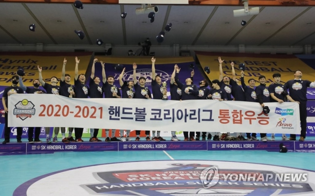 (청주=연합뉴스) 김동찬 기자 = 두산이 SK핸드볼 코리아리그 여섯 시즌 연속 통합우승을 달성했다.