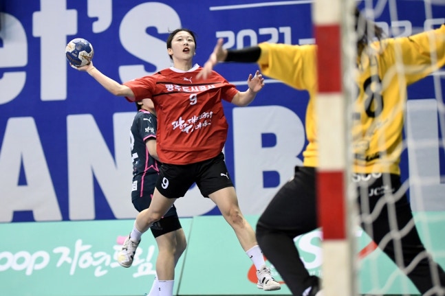(서울=연합뉴스) 김동찬 기자 = 인천시청이 혼자 10골을 몰아친 오예닮을 앞세워 2021-2022 SK핸드볼 코리아리그 여자부 경기에서 시즌 첫 승을 따냈다.