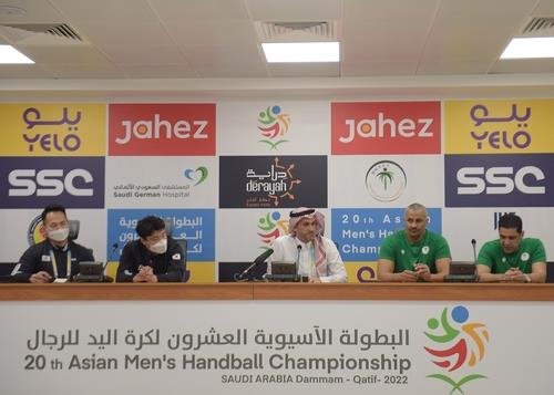 24일 사우디전이 끝난 뒤 기자회견. 왼쪽 한국 선수단만 마스크를 착용했다. 2022.1.26 [대한핸드볼협회 제공. 재판매 및 DB 금지]
