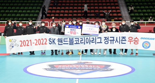 [대한핸드볼협회 제공. 재판매 및 DB 금지](서울=연합뉴스) 김동찬 기자 = 두산이 2021-2022 SK핸드볼 코리아리그 남자부 정규리그 최종전을 승리로 장식했다.