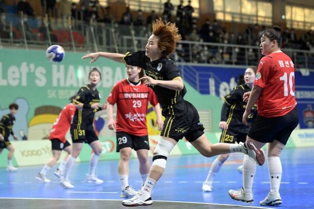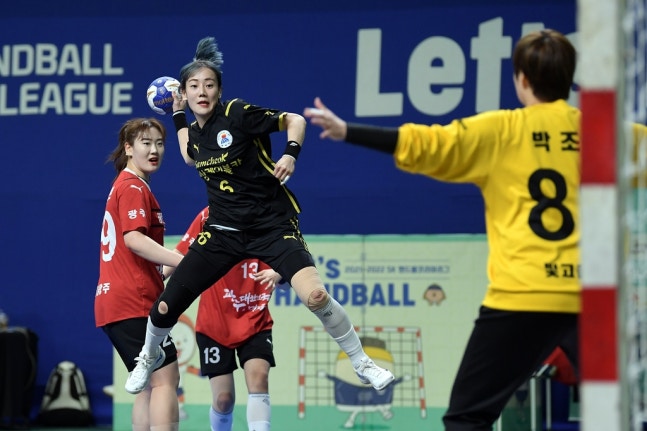 (서울=연합뉴스) 김동찬 기자 = 삼척시청이 2021-2022 SK핸드볼 코리아리그 여자부 챔피언결정전에서 유리한 고지에 올랐다.