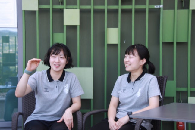 이가을(왼쪽)심판과 이은하 심판이 27일 슬로베니아 첼레의 IHF 심판 숙소에서 공동취재단과 인터뷰 도중 환하게 웃고 있다. 대한핸드볼협회 제공.