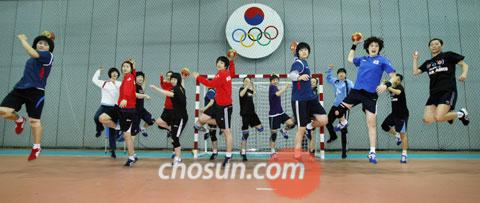 - ▲ 힘껏 뛰어오른 여자핸드볼 국가대표 16명. 베이징올림픽에서 온몸을 던졌던 노장들의 빈자리를 메우는 새로운 얼굴들이다. 예전보다 어려지고 날렵해진 이들은 세계선수권대회 4강이라는‘우생순’2탄을 준비하고 있다./채승우 기자 rainman@chosun.com
