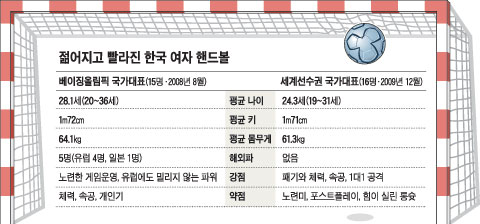 한국 여자핸드볼 하면 '우생순(우리 생애 최고의 순간)'이란 말이 가장 먼저 떠오른다. 2004 아테네올림픽에 이어 지난해 베이징올림픽에서 여자 핸드볼이 '우생순'의 감동 드라마를 쓸 수 있었던 원동력은 오영란, 오성옥(이상 당시 36세) 등 노장들의 투혼이었다. 30세가 넘는 선수들이 코트에 온몸을 내던지고도 4강에서 패배의 눈물을 흘렸을 때, 많은 사람은 금메달보다 더 진한 감동을 느꼈다.