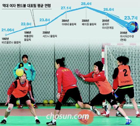 새 대표팀의 평균 연령은 23.7세. 1992년 바르셀로나 올림픽 때의 21세 이후 가장 젊은 팀이 됐다. 베이징 올림픽 멤버는 골키퍼 이민희(30)와 센터백 김온아(23) 두 명만 남았다.